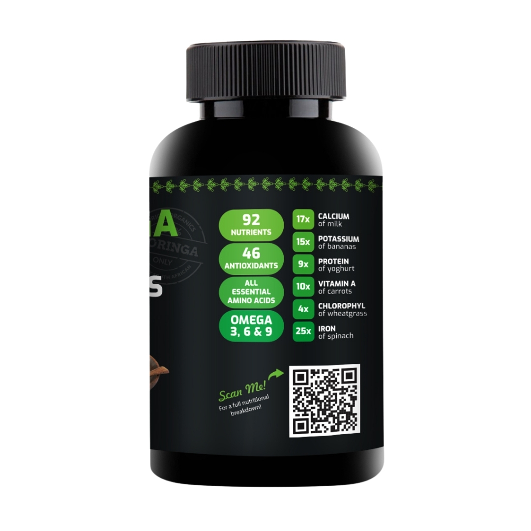 100% Natural, Pure, Organic Dry Leaf Moringa Powder in Vegan Capsules. Moringa capsules are easy to ingest, containing 300 mg of all natural Moringa Oleifera.